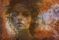 Dit werk combineert een vrouwelijk portret met een abstracte, verweerde textuur die doet denken aan roestige metalen oppervlakken en aardse elementen. Het gezicht van de vrouw lijkt door een gelaagd filter te worden waargenomen, waarbij haar expressieve blik mysterie en introspectie oproept. De warme tinten, variërend van diep oranje tot roestbruin, vloeien samen met blauwachtige en paarse accenten, wat een intrigerend contrast creëert.