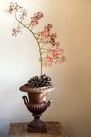 Deze gestileerde stillevenfoto ademt de essentie van wabi-sabi — de Japanse esthetiek die schoonheid vindt in imperfectie, vergankelijkheid en eenvoud. In een klassieke vaas rust een fragiele tak met besjes, subtiel uitgebalanceerd met dennenappels, tegen een zachte lichtval aan. De compositie is sober maar doordacht, en roept een gevoel op van tijdloosheid, introspectie en harmonie. De bewerking in Photoshop accentueert het spel van licht en textuur zonder de natuurlijke rust te verstoren, waardoor het beeld meditatief aanvoelt.
