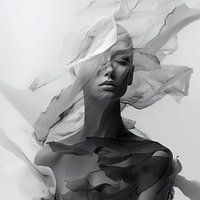 In deze prachtige zwart-wit compositie is de elegantie van de vrouw vastgelegd te midden van een wervelwind van vloeiende stoffen. De zachte contouren van haar gezicht contrasteren met de ruwe en grillige textuur van het omhullende materiaal, wat een sfeer van sereniteit te midden van chaos oproept.
