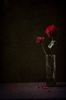 Dit emotionele fine-art stilleven toont twee dieprode rozen, subtiel geplaatst in een slanke glazen vaas tegen een sfeervolle, donkere achtergrond. De grotere roos staat fier, terwijl de kleinere roos al tekenen van vergankelijkheid toont, met enkele losse blaadjes die elegant op de donkere ondergrond liggen. Dit detail voegt een…