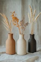 Dit kunstwerk toont de schoonheid van eenvoudige, gedroogde planten en kruiden, zorgvuldig gerangschikt in drie handgemaakte, keramische vazen van natuurlijke kleuren. Het brengt een gevoel van rust en verbondenheid met de natuur over, waarbij de gedroogde materialen een blijvende schoonheid vertegenwoordigen, in contrast met…