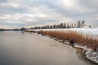 Nederlands landschap met vergeeld riet langs een bevroren meer. Op de achtergrond is een besneeuwde dijk waarop twee onherkenbare mensen samen wandelen. De foto is op een vroege winterochtend gemaakt bij het Gat van den Ham op de grens van de dorpen Hooge Zwaluwe en Lage Zwaluwe, beiden behorend tot de gemeente Drimmelen, provincie…