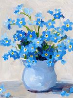 Vergeet-me-niet Bloemen | Forget Me Not Vibes - Dit bloemen schilderij toont een prachtige vaas met helder blauwe vergeet-me-niet bloemen, die stralend opvallen tegen een zachte, lichte achtergrond, perfect voor een moderne inrichting.