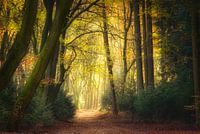 Een bospad op een prachtige herfstochtend met zonlicht dat de glanzende gele bladeren verlicht. Overhangende beuken aan de linkerkant omlijsten het tafereel. Deze bomen zijn er niet meer, ze zijn omgevallen maanden nadat ik dit tafereel vastlegde.
