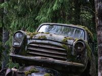 Kleurenfoto van een vergeten auto in een bos. De vergaat langzaam tot roest en is bedekt met mos.