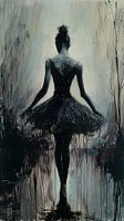 De danseres staat met haar rug naar de kijker, haar armen lichtjes gebogen terwijl ze in een gracieuze houding verkeert. Het schilderij is uitgevoerd in donkere, monochrome tinten, met vloeiende penseelstreken die haar silhouet krachtig en tegelijk fragiel maken. De subtiele druppels en lijnen die langs haar figuur naar beneden lopen, geven een indruk van vloeibaarheid, alsof ze samensmelt met de achtergrond. De donkere kleuren worden doorsneden door zachte, bijna etherische lichte tonen, wat een dramatisch contrast creëert en haar elegantie nog meer benadrukt. De sfeer van het werk is melancholisch, bijna dromerig, en straalt een gevoel van eenzaamheid en zelfreflectie uit.