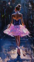 Haar rug is naar de kijker gericht, en haar delicate roze tutu contrasteert prachtig met de donkere, nachtelijke achtergrond die is gevuld met diepe blauwtinten en abstracte vormen. De lichtval op haar rug en benen benadrukt haar gratie en verfijning, terwijl de dikke penseelstreken en het expressieve kleurgebruik de dynamiek van haar beweging vastleggen. De achtergrond, met zijn vage contouren en losse penseelstreken, suggereert een droomwereld waarin de danseres haar eigen weg volgt. Het werk straalt een gevoel van eenzaamheid, maar ook kracht uit, alsof de danseres volledig opgaat in haar kunst, alleen met haar gedachten en de muziek.