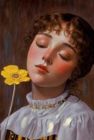 "Vergeten in Bloemendromen" is een werk wat uit de renaissancetijd lijkt te komen en dat de toeschouwer betovert met zijn verfijnde technieken en sublieme lichtspel. In dit schilderij staat een jonge vrouw centraal, gekleed in een hoge, smetteloos witte blouse die haar frisheid en zuiverheid benadrukt. Haar roodachtige blosjes weerspiegelen de opwinding van het moment terwijl ze met haar ogen dicht geniet van de bedwelmende geur van een gele bloem die ze in haar hand houdt.