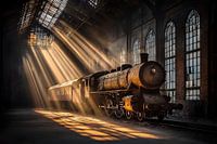 Een historische stoomlocomotief staat in het midden van een uitgestrekt, verlaten fabrieksgebouw, vergezeld door een nostalgisch passagiersrijtuig. De zonnestralen dringen door de kapotte dakramen en baden de trein in een warm, gouden licht dat de details van het oude metaal en hout laat schitteren. De pracht van vervlogen tijden wordt…