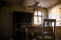 Een stille kamer, verlaten en overgelaten aan de tijd. Het warme licht van de zon breekt door een gebroken raam en verlicht een oude houten tafel, waarvan het oppervlak getekend is door de jaren. Stoffig meubilair staat op de achtergrond en vertelt in stilte verhalen uit een vervlogen tijdperk. De muren zitten vol scheuren en het eens zo levendige behang is aan het afbladderen. Een kapotte plafondlamp hangt melancholisch aan het plafond. Deze kamer belichaamt de charme van verval, waar elk detail een ander verhaal vertelt - van stil verval tot de harmonie van licht.