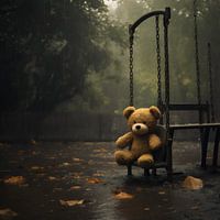 De laatste stralen van de zon werpen een laatste glimp op de teddybeer die eenzaam schommelt in de donkere avond. Het enige geluid is het zachte kraken van de schommelkettingen. Hij wacht geduldig, in de hoop dat zijn eigenaar zal terugkeren om hem uit de eenzaamheid te bevrijden.