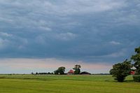Weids landschap, vergezichten en uitzicht over het Friese platteland onder een dreigende stormlucht. Stormachtige donkere regenwolken boven een dorpje tussen Sneek en Makkum, Friesland. Noodweer, regen, onweer en storm. Onstuimig weer op komst. Een spectaculair natuurverschijnsel.