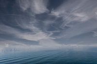 Een panorama van een heiige horizon met op de voorgrond palen waaraan visnetten zijn bevestigd qua kleur is dit vrij neutraal en mooi romantische uitstraling.