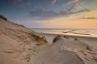 Vanuit de duinen op Texel bij Paal 9 een vergezicht naar de horizon bij zonsondergang. Twee mensen wandelen aan rand van de branding