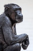 Deze indrukwekkende close-up foto legt de expressieve en intelligente blik van een chimpansee vast. De chimpansee zit in een ontspannen maar nadenkende houding, wat een gevoel van introspectie en rust uitstraalt. De details in de textuur van de huid, het grijzende haar, en de diepe, doordringende ogen tonen de unieke kenmerken van dit dier en brengen een sterke connectie tot stand met de kijker.