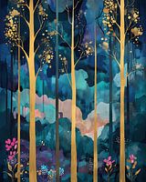 Dit fascinerende kunstwerk toont een gestileerde bosscène badend in de etherische tinten van de schemering. Hoge, slanke bomen met gouden stammen staan als schildwachten tegen een achtergrond van wervelend blauw, groen en paars, wat het mysterie en de diepte van een dicht bos oproept. Delicate gouden bloesems sieren de takken en voegen…