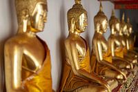 Te midden van de spirituele rust van Wat Pho, een van de oudste en belangrijkste tempels van Bangkok, staan de vergulde Boeddhabeelden in stralende pracht. Deze sublieme figuren, die Boeddha Gautama uitbeelden op het moment van zijn verlichting, stralen oneindige sereniteit en waardigheid uit. Hun handen vormen de bhumispara mudra, het gebaar van het aanraken van de aarde - een symbool van het beslissende moment waarop Boeddha de aarde aanriep als getuige van zijn verlichting. Het goud dat hun oppervlak bedekt vangt het licht van de tropische zon en doet de figuren bijna onaards lijken. Hun lichtgevende, bijna hemelse contouren lijken de bezoeker mee te voeren naar een wereld van diepe vrede en innerlijke wijsheid.