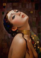 Dit prachtige kunstwerk in de stijl van Gustav Klimt beeldt een halfnaakte vrouw af, haar sensuele vormen gehuld in weelderige bruine en goudtinten. De vrouw kijkt schuin omhoog met een betoverende blik, waarin een mix van verlangen en mysterie schuilt. Haar gezicht straalt een serene kracht uit.