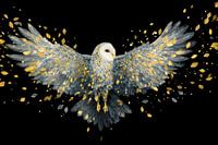 Een uil zwiert over een zuiver zwart veld, de vleugels zijn volledig uitgestrekt en gemaakt van gelaagde zilveren en gouden veren. Fijn lijnwerk danst over elke pluim terwijl gouden bladachtige fragmenten zich naar buiten verspreiden, wat de compositie een gevoel van beweging en stille kracht geeft.