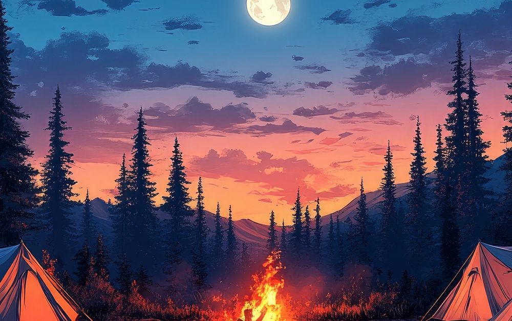 Onder de stralende gloed van een volle maan en een deken van fonkelende sterren komt een gezellige camping tot leven. Vrienden verzamelen zich rond een knapperend kampvuur, omringd door levendige tenten en serene weerspiegelingen in een rustig meer. Dit kunstwerk vangt de magie van gedeelde verhalen, gelach en de tijdloze schoonheid van de natuur.