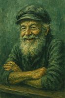 Dit schilderij toont een vrolijke schipper met een volle baard en karakteristieke pet, rustend met gekruiste armen. De warme glimlach en twinkelende ogen verraden een man vol verhalen en levensvreugde. De diepe groentinten en expressieve penseelstreken geven het werk een stoer, rustiek karakter. Let op de subtiele lichtval op het gezicht en handen, die het doorleefde leven benadrukken. Dit schilderij straalt warmte en gezelligheid uit, alsof je in een havenkroeg naar sterke zeeverhalen luistert. Perfect voor liefhebbers van maritieme sferen, nostalgie of een band met de zee. Ideaal in een landelijke woning, een nautisch interieur of bij mensen die houden van authentieke persoonlijkheden en het ruige, vrije leven op het water.