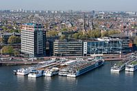 Amsterdam The Netherlands Elevated view of the city seen from Adam Lookout observation deck. River boat cruise ships moored along Het Ij, Port of Amsterdam Building, Kamer van Koophandel (Chamber of Commerce.)