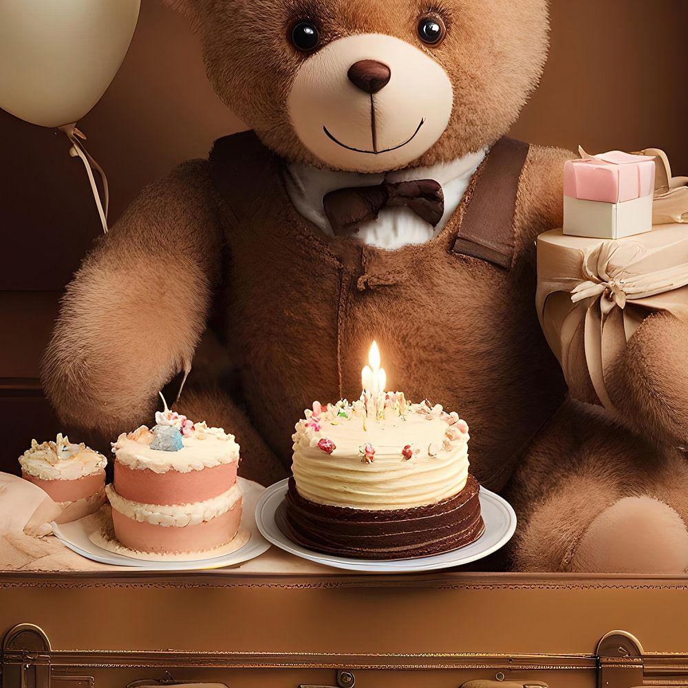 Een teddybeer zit in een vintage koffer. In de koffer zitten 3 verjaardagstaarten, één met een kaarsje. Er zweven ook verschillende ballonnen in de lucht rond de koffer.