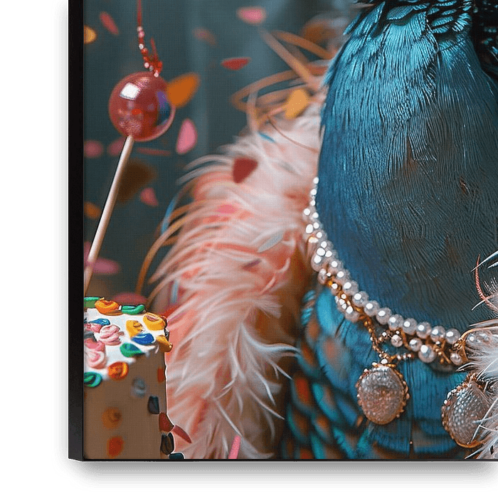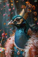 Een uitgebreid geklede pauw viert zijn verjaardag omringd door confetti in een disco-outfit uit de jaren 60 en 70.
