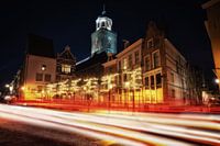 Verkeer voor de Lebuïnuskerk met kerstverlichting in Deventer.