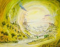In dit schilderij wordt de kijker meegevoerd naar een tunnelachtige en eigenzinnige wereld die wordt gekenmerkt door een unieke combinatie van elementen. De scène wordt doorkruist door een grote tunnel, als een bovenmaatse buis en een enorme sopraanbrug, die samen misschien wel fungeren als een labyrint dat de blik de verte in…