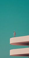 Het gebouw lijkt te bestaan uit zwevende balkons of platforms met een zachte pastel roze tint, die contrasteren tegen de effen turquoise lucht. De astronaut staat rustig, met het gezicht naar de horizon gericht, terwijl het spiegelende vizier zijn gezicht verbergt, wat een gevoel van anonimiteit en mysterie oproept.