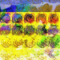 Een verkenning van eindeloze cirkels en vormen. Dit is er een uit een serie veelkleurige abstracten onder de titel Exploring Eternity, met een sterk gebruik van geel met een vleugje groen en wat blauw en paars als contrast.