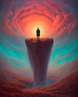 Een intrigerend tafereel van een man die op de top van een klif staat, een episch beeld dat surrealisme en avontuur omarmt.