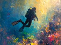 De duiker is prominent in beeld, geaccentueerd door de donkere uitrusting en vinnen tegen de rijke blauwe en veelkleurige achtergrond die het onderwaterleven suggereert. Het gebruik van licht en schaduw brengt diepte in het schilderij, met heldere lichtplekken die lijken op de stralen van de zon die door het wateroppervlak heen dringen. De abstracte penseelstreken geven een gevoel van beweging en de willekeurige aard van het oceaanlandschap. Het kunstwerk is een samensmelting van realisme en fantasie, waarbij de kleuren buiten de grenzen van de werkelijkheid lijken te treden en een droomachtige, bijna magische sfeer creëren.