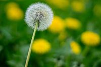 Verkleurde paardenbloem met verse gele paardenbloem op een groene weide