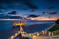 Historische pier van Sellin op het eiland Rügen in Mecklenburg Vorpommern aan de Oostzee. Sfeervolle ochtend op het strand van Sellin met strandstoelen en verlichte pier kort voor zonsopgang. Muurschildering 320023ays