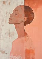 Een strak, minimalistisch portret van een vrouw met zuivere lijnen en een kleurenpalet van aardetinten, koraal en oudroze. De focus ligt op haar elegante houding en uitdrukking, met subtiele hints van haar primadonna-karakter. De achtergrond is een eenvoudige gradiënt die de aanwezigheid van het onderwerp en haar ingetogen verlangen…