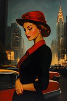 Het schilderij toont een vrouw uit de jaren 1950, gekleed in een elegante jurk die typerend is voor die periode. Ze staat op een straathoek en staart peinzend de nacht in. Haar gezichtsuitdrukking is een mengeling van melancholie en verlangen terwijl ze naar de levendige stad om haar heen staart.