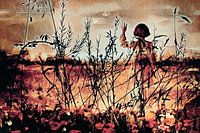 Verlangen naar vrede dat is volgens mij iets wat veel kinderen doen, in ieder geval dit meisje. En vrede kun je natuurlijk wensen op meerdere gebieden, dan alleen oorlog, denk aan echtscheidingen bijvoorbeeld. Dat verlangen is hier natuurlijk te zien aan het vredesteken wat ze maakt met haar handen. Doordat we haar gezicht niet kunnen zien is ook alleen dat vredesteken belangrijk. Ze staart in de verte over haar geboorteland. Achter haar groeien planten die eruit zien als stekels, tenminste dat lijkt zo door de puntige blaadjes. De witte duiven in de lucht zijn ook een symbool voor vrede en dus onderstrepen ze het vredesteken dat het meisje met haar hand maakt. De klaprozen op de voorgrond staan symbool voor de eerste wereldoorlog maar ook zijn ze het symbool voor de veteranen in deze wereld. Ze geven hier aan waarom ze zo verlangt naar vrede. De kleuren van dit werk zijn roze en rood en alle tinten die daar tussen liggen, ook beige, bruin, oranje en zwart zijn hier terug te vinden. Een sterk symbolisch werk dat past in deze tijd.