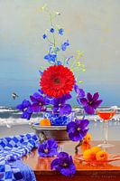Stilleven van abrikozen en paarse clematis Op een oude tinnen fruitschaal met gerbera en Delphinium op een houten tafel met een Hollandse keukendoek en een kristallen hals met daarin abrikozenlikeur. In de achtergrond zie je de zee met meeuwen. De zee die me zo lief is. Het licht aan onze Nederlandse kust is ongelofelijk mooi. Ik wilde graag zo’n zeegezicht combineren met mijn stilleven. De clematis groeit overvloedig in onze tuin.