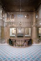 Aegidium is een prachtige verlaten bioscoop, verborgen in het volle zicht in een drukke straat in Brussel, België. Van buitenaf zou je niet verwachten dat er achter de kleine deur meerdere kamers met een totale oppervlakte van 3.260 m² zijn gelegen. Een mix van art nouveau en art deco-elementen is terug te vinden in het hele gebouw. De hoofdzaal (bioscoop) is echter ontworpen in een prachtige Moorse stijl door architect Léon Denis. Dit is een foto van de ingang van de vergaderruimte.