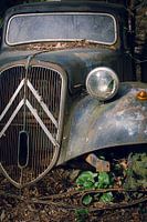 Op dit autokerkhof staan vele verlaten en vervallen auto's, waaronder een Citroën oldtimer. De natuur neemt het langzaam weer over