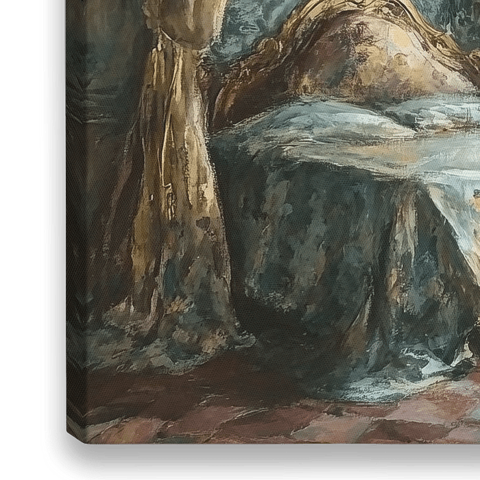 Verlaten Elegance - Dit interieur schilderij toont een oude, statige slaapkamer met een klassiek hemelbed, zware gordijnen, en zichtbare slijtage waardoor een gevoel van vergane glorie opgewekt wordt, versterkt door natuurlijk licht dat via grote vensters binnenstroomt.