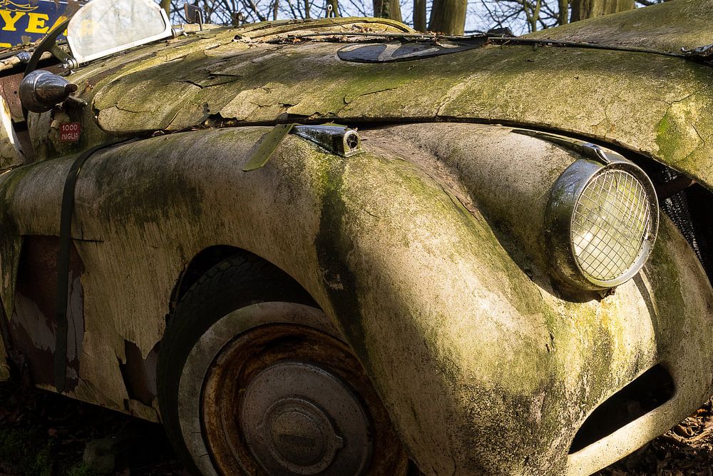 Roestige, verlaten en vervallen Jaguar XK 140 in een bos