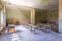 Dit is een foto van een van de verlaten klaslokalen in een groot en verlaten gebouw in de Zwitserse bergen. Het gebouw staat al ruim 50 jaar leeg en ligt in een hele gezonde omgeving. Hier hebben veel kinderen jarenlang plezier gehad. Inmiddels wordt er op het terrein gewerkt om er weer iets van te gaan maken.