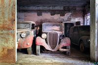 In deze verlaten garage staan drie prachtige oldtimers. Verstopt tussen de bomen en planten was de garage moeilijk te vinden. De Oldtimers zitten onder het stof, de spinnenwebben en zijn flink in verval.