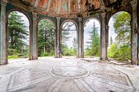 Dit is een foto van een verlaten pantheon dat zich bevind bovenop een berg met uitzicht op de stad Sukhumi in Abchazië. Het pantheon is in hevig verval en is omgeven door planten en bomen.
