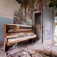 Dit is een foto van een piano die in zwaar verval is en in een verlaten muziekschool staat. Het was een heel kleine kamer en een uitdaging om te fotograferen. In het gebouw vond ik meerdere piano's die achterbleven.