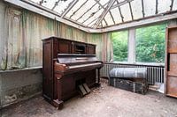 Dit is een foto van een piano die is achtergelaten in een verlaten en vervallen kasteel.