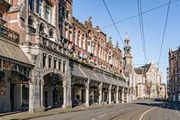 Verlaten Raadhuisstraat in Amsterdam tijdens een zonnige doordeweekse ochtend. De straat is leeg en verlaten en er is geen verkeer op straat vanwege de COVID-19 pandemische corona virus lockdown die een spookstad sfeer geeft aan de foto.